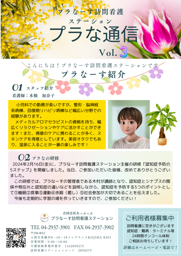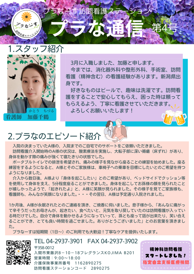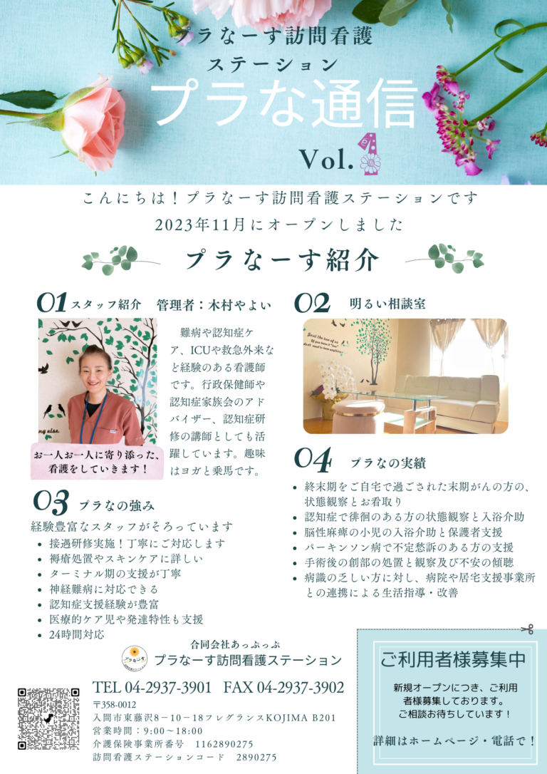 プラなーす訪問看護ステーションでは、私たちの看護を発信するためにプラな通信を発行しています。今回は第 […] -