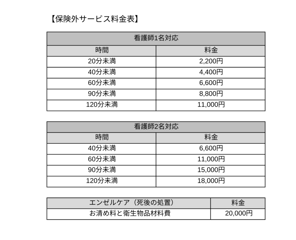 ※事業所より10km以内は交通費無料。10kmを超えた地点から1kmごとの50円の訪問交通費をいただきます。